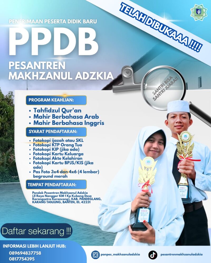 INFOBAHARI.COM, PANDEGLANG — Pondok Pesantren Makhzanul Adzkia, Kabupaten Pandeglang, Banten, resmi membuka Penerimaan Peserta Didik Baru (PPDB) Tahun Ajaran 2026/2027.